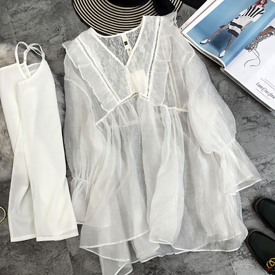 17 đầu mùa thu mới Pháp lãng mạn V-Cổ ren lá sen tay áo búp bê áo sơ mi xù lỏng áo sơ mi chiffon nữ các kiểu áo sơ mi nữ ngắn tay đẹp