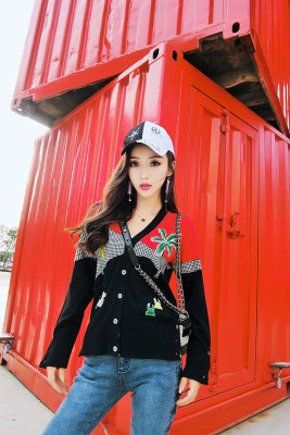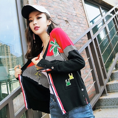 2018 đầu mùa thu áo nữ giản dị thường đi xe kỳ nghỉ gió dừa màu đỏ và màu đen tương phản màu áo len mỏng áo khoác cardigan ao len nu