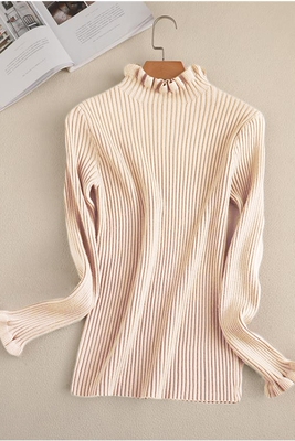 2018 đầu mùa thu mới bằng gỗ tai cổ áo áo thun đan đáy áo mỏng giảm béo hoang dã xù nửa cao cổ áo sơ mi áo thun Áo / áo thun