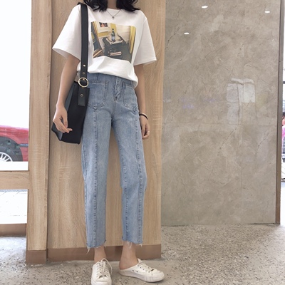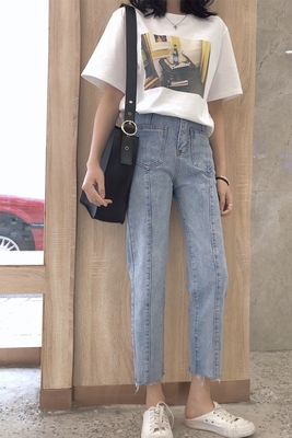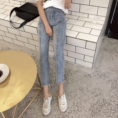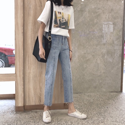 2018 Hàn Quốc phiên bản của nước rửa trắng túi phía trước quần chân cao eo thẳng quần chín điểm jeans nữ mùa xuân quần jean nữ lưng cao