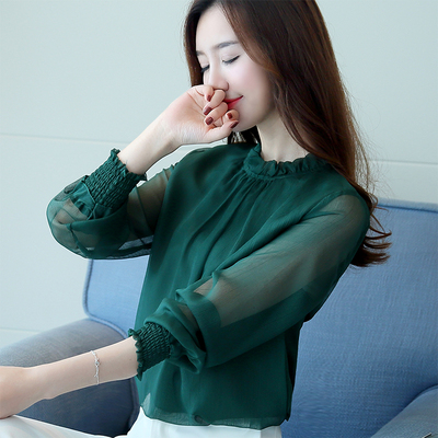2018 mới mùa xuân dài tay voan áo sơ mi mỏng nhỏ áo mùa thu đáy áo mùa thu quần áo bên trong lấy ren trên quần áo thủy triều áo sơ mi caro nữ form rộng Áo sơ mi chiffon ren