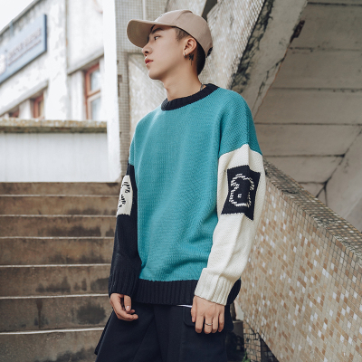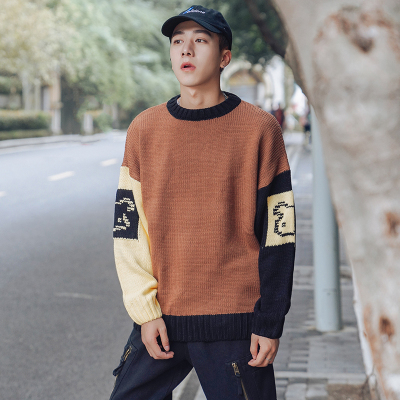 2018 mùa đông mới áo len cổ tròn xu hướng áo len lỏng nam khâu tương phản màu áo len giản dị áo polo