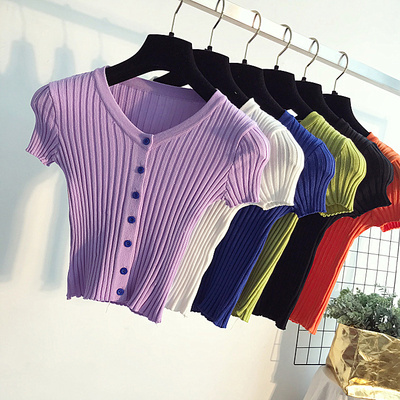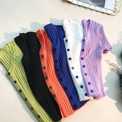 2018 mùa hè mới Han Fan hoang dã màu rắn Mỏng đơn ngực ngắn tay đan cardigan phần ngắn mỏng bên ngoài mặc top ao len