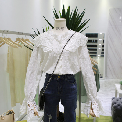 2018 mùa thu lỏng màu rắn tính móc hoa hollow khâu ren trumpet tay áo dài tay áo voan áo top nữ D323 áo sơ mi nữ cao cấp