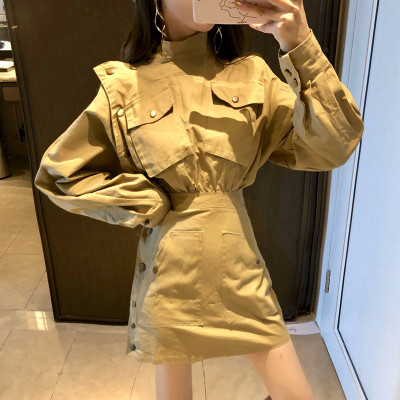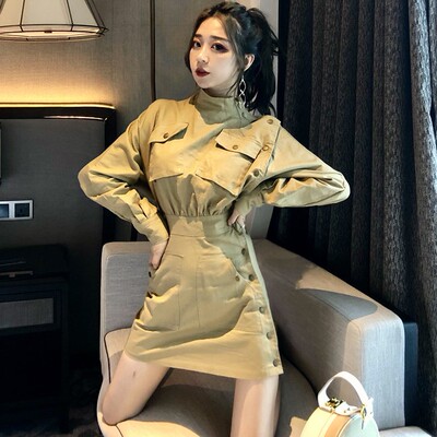 2018 mùa thu mới Hàn Quốc phiên bản của bán cao cổ áo đầm eo Mỏng Một từ váy màu rắn dài tay váy phụ nữ vay chu a