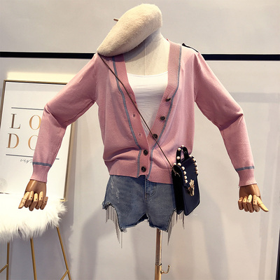 2018 mùa thu mới lỏng V-Cổ áo len nữ Hàn Quốc phiên bản của sự tương phản mềm mại màu sắc đơn ngực tính bên ngoài chiếc áo đan len áo len tay phồng Cardigan