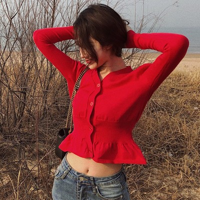2018 mùa thu mới retro xù cổ chữ V nút ngắn eo cao tay dài đan áo len cardigan áo cardigan nữ hàn quốc