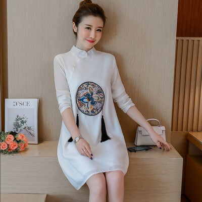 2018 mùa thu retro phong cách quốc gia Trung Quốc phụ nữ thêu hoa lỏng một chiếc váy dài tay cải tiến váy sườn xám váy chữ a