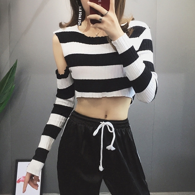 2018 mùa xuân mới cẩn thận ra khỏi vai sọc cao eo tiếp xúc với rốn áo len siêu đoạn ngắn áo sơ mi đáy áo triều nữ áo len nữ hàng hiệu Vòng cổ áo len