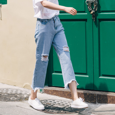 2018 mùa xuân mới cao eo lỗ chín điểm chân rộng jeans nữ lỏng mỏng sinh viên thô cạnh quần chân rộng thủy triều quần jean nữ cạp cao