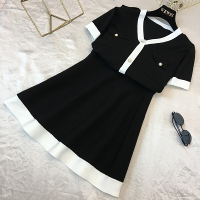 2018 mùa xuân mới Han Fan woman máy cẩn thận hit màu đen và trắng knit top + cao eo váy phù hợp với kiểu đồ bộ