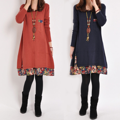 2018 mùa xuân mới nữ Hàn Quốc thường chất béo mm kích thước lớn lỏng dài tay áo đáy hoa khâu Một từ ăn mặc đầm suông chữ a