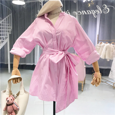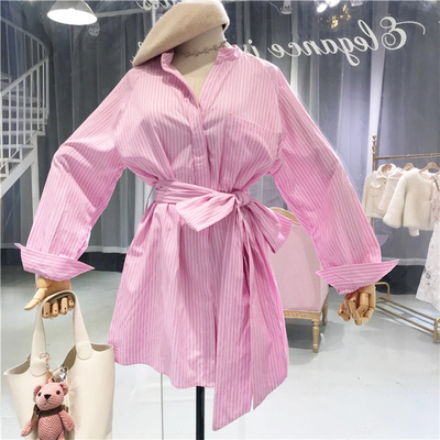 2018 mùa xuân và mùa hè mới của Hàn Quốc phiên bản của nhẹ nhàng một từ váy nhỏ hương thơm áo sơ mi cô gái màu hồng ăn mặc nữ các kiểu đầm xòe