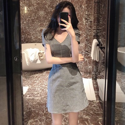 2018 xuân mới retro váy cổ chữ V eo thon Váy ngắn tay vuông nhỏ Một chiếc váy chữ nữ - A-Line Váy váy chữ a công sở