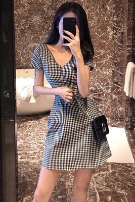 2018 xuân mới retro váy cổ chữ V eo thon Váy ngắn tay vuông nhỏ Một chiếc váy chữ nữ - A-Line Váy váy chữ a công sở A-Line Váy