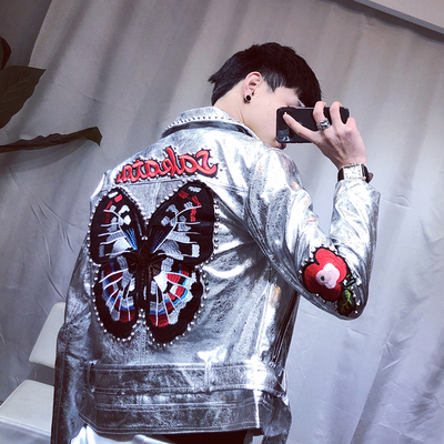 Áo khoác nam nam 2018 áo khoác mùa thu mới Slim Thanh niên bướm thêu đầu máy da đinh tán áo khoác hoodie nam Quần áo lông thú