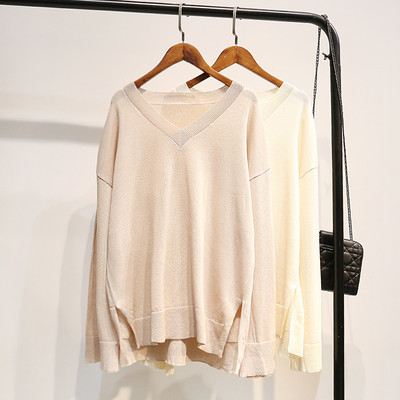 Áo len cổ chữ V nữ cổ dài tay hoang dã đơn giản j 2018 xuân hè mới lười áo len gió mỏng phần áo cổ lọ