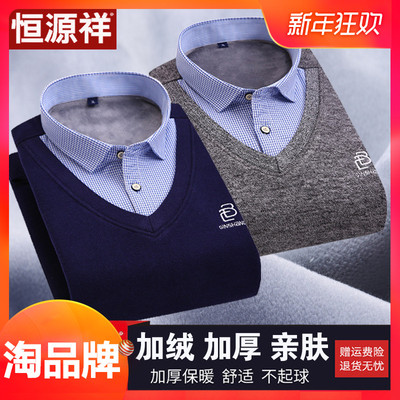 Áo len nam hai dây giả Hengyuanxiang cổ áo cộng với nhung dày mùa thu và mùa đông nam trung niên áo len cha áo thun nam hàng hiệu