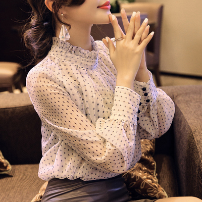 Áo sơ mi voan chấm bi nữ tay dài 2019 mùa thu mới áo nhỏ mùa xuân áo nhỏ họa tiết ren nước ngoài ren áo dài tay nữ Áo sơ mi chiffon ren