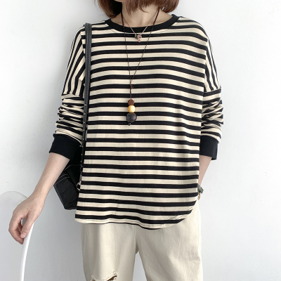 Áo thun cotton nữ mùa thu mới rộng kích cỡ lớn giản dị dài tay chạm đáy áo văn học nữ sọc hoang dã - Áo phông áo phông polo nữ