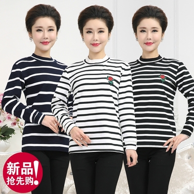 Áo thun nữ tay dài trung tính sọc cotton hàng đầu Mẹ trung niên tải cotton thêu đáy quần áo mùa thu phong cách mới mua áo phông nữ