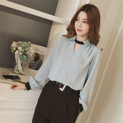 Áo voan trắng cổ chữ V top nữ mùa thu đông 2018 phiên bản mới của Hàn Quốc của máy chăm sóc rộng tay hoang dã áo sơ mi dài tay áo sơ mi nữ dài tay hoa