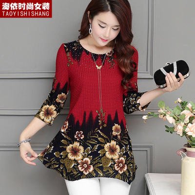 Áo xuân 2019 mới dành cho mẹ áo sơ mi nữ dài phần XL béo MM tay áo bảy điểm in áo voan áo kaki nữ Cộng với kích thước quần áo
