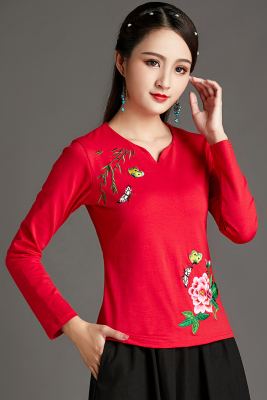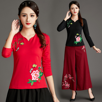 Banyan gió quốc gia mùa thu cotton thêu dài tay áo thun nữ cỡ lớn Trung Quốc phong cách thêu đáy áo sơ mi thủy triều - Áo phông áo thun nữ tay lỡ Áo phông