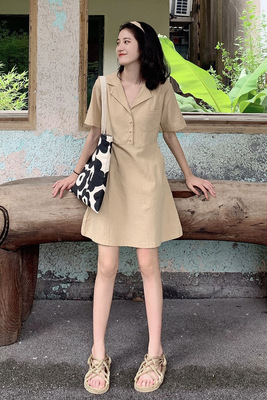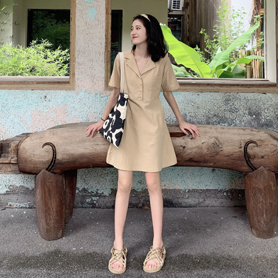 Bộ đồ vừa vặn với cổ áo sơ mi màu rắn 2019 hè trên Hồng Kông mới tinh xảo mỏng Một chiếc váy từ nữ - A-Line Váy đầm xòe