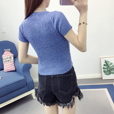 Châu âu và Hoa Kỳ gió Slim ngắn tay áo nút nhỏ chủ đề đáy áo bông đoạn ngắn rốn dệt kim T-Shirt áo sơ mi nữ mùa hè áo nữ cao cấp Áo / áo thun