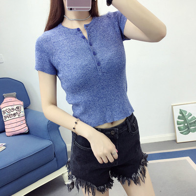 Châu âu và Hoa Kỳ gió Slim ngắn tay áo nút nhỏ chủ đề đáy áo bông đoạn ngắn rốn dệt kim T-Shirt áo sơ mi nữ mùa hè áo nữ cao cấp