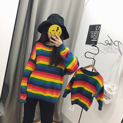 CHICFISH thủy triều cha mẹ-con tải 2018 mùa thu và mùa đông mới sọc cầu vồng lỏng lẻo sợi len áo len mẹ và con gái mẹ và con quần áo trẻ sơ sinh Trang phục dành cho cha mẹ và con