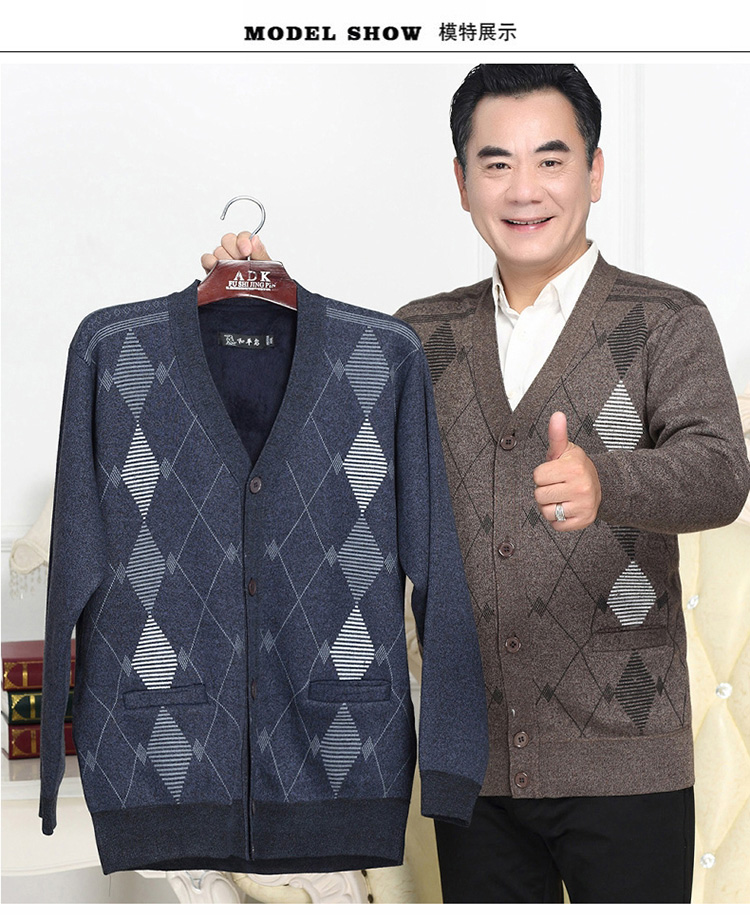 Đàn ông trung niên mùa thu đông mới cộng với áo len dệt kim nhung dày Bố mặc áo len đan cổ chữ V blazer nam Cardigan