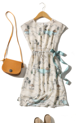 Đặt trên giây và chuyển sang màu trắng và đẹp! Màu nude, ánh sáng thanh lịch và trưởng thành cao eo tẩm in lụa đầm Tao Tao váy body nhún eo