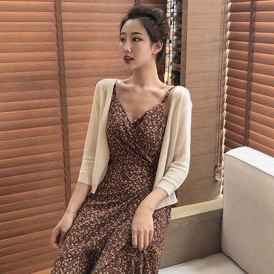 Đầu mùa thu Hàn Quốc phiên bản của chic kem chống nắng knit cardigan áo khoác mỏng hai mảnh hoa eo bandage strap dress nữ đầm nhún eo