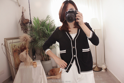 Đầu mùa thu nhỏ hương thơm side tương phản màu sắc đôi pocket V-Cổ đơn ngực dài tay đan áo khoác cardigan A 2128 áo len cổ tim Cardigan