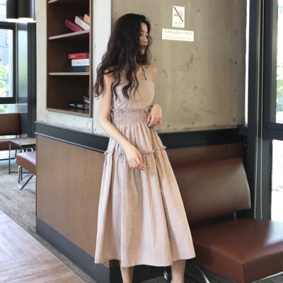 Dora Chaoren Hall Hồng Kông hương vị retro chic gỗ hoang dã tai eo eo là ren mỏng kẻ sọc váy nữ mùa hè váy cắt eo