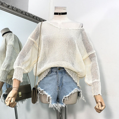 G 21 lớn vòng cổ lỏng màu rắn là áo sơ mi mỏng mùa hè trái tim Hàn Quốc phiên bản của phụ nữ ngọt ngào openwork áo len áo thun form rộng