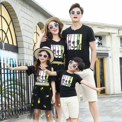 Gia đình bãi biển gia đình cha mẹ-con gạc đầm đen một bộ đồ 4 mảnh Hàn Quốc quần short ngắn tay - Trang phục dành cho cha mẹ và con áo thun đẹp cho cả nhà Trang phục dành cho cha mẹ và con