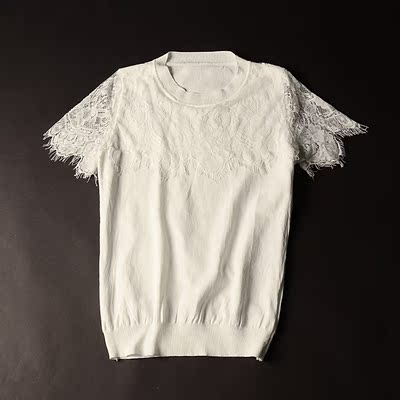 H 1 2018 mới mùa thu Hàn Quốc phiên bản của cổ tròn màu không tay ren khâu là áo len mỏng áo sơ mi nữ quần áo nữ đẹp Áo / áo thun
