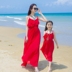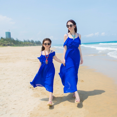 Hai loại phương pháp mặc Váy đi biển dành cho phụ huynh-trẻ em quây quây Đầm voan xanh - Trang phục dành cho cha mẹ và con áo gia đình 3 người Trang phục dành cho cha mẹ và con