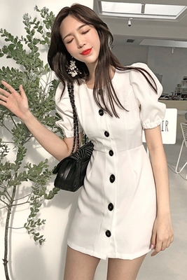Hàn Quốc phiên bản của chic gió retro hit màu vòng cổ ngắn tay phồng tay áo đơn ngực cao eo là mỏng Một từ ăn mặc nữ mùa hè đầm xòe