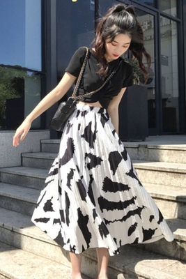 Hàn quốc phiên bản của chic kink V-Cổ ngắn T-shirt + xếp li mực cao eo váy hai mảnh phù hợp với thời trang phù hợp với đồ mặc nhà