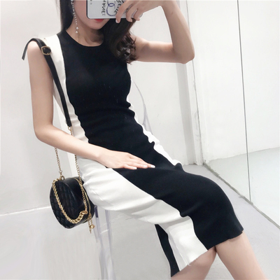 Hàn Quốc phiên bản của màu khâu trong phần dài của dệt kim vest váy nữ 2018 mùa hè mới cao eo mỏng tính khí ăn mặc đầm xếp ly eo