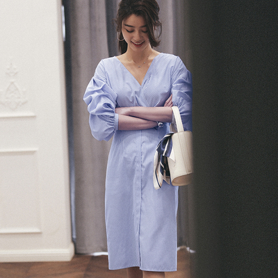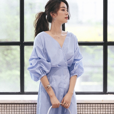 Hana FURNA mùa hè siêu đẹp ngăn xếp tay áo v-cổ sọc đèn lồng tay áo đầm đầm váy buộc dây eo Váy eo cao
