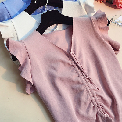Hồng Kông-hương vị chic retro dây rút cổ điển ren ngắn slim nhỏ bay tay áo len là mỏng cơ sở màu rắn T-Shirt áo khoác cardigan nữ Áo / áo thun