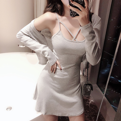 Hồng Kông hương vị retro chic sexy slim chữ thập strap dress + màu rắn kem chống nắng hoang dã cardigan phù hợp với nữ thủy triều bộ đồ Bộ đồ