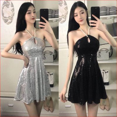 Hộp đêm gợi cảm của phụ nữ ngọc trai treo cổ sequin rỗng ngực hở ngực thon thả backless Một từ váy lớn - A-Line Váy đầm caro chữ a