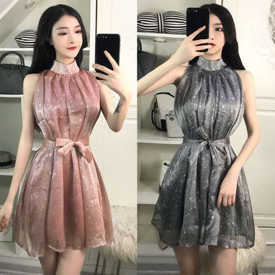 Hộp đêm mùa hè 2019 gợi cảm của phụ nữ treo cổ quây thắt eo eo Một chiếc váy plycodon xếp li xếp li - A-Line Váy đầm xòe tay dài