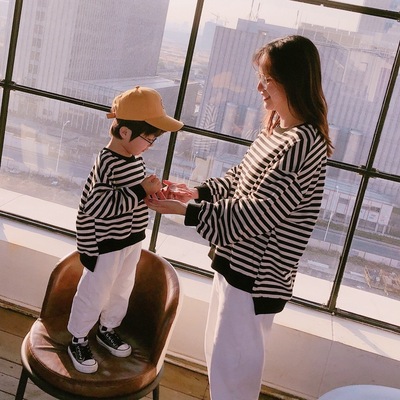 Khác nhau giữa mùa thu cha mẹ-con cái áo len dài tay trẻ em Áo thun cotton Hàn Quốc sọc rộng thời trang - Trang phục dành cho cha mẹ và con trang phục dành cho cha mẹ và con Trang phục dành cho cha mẹ và con